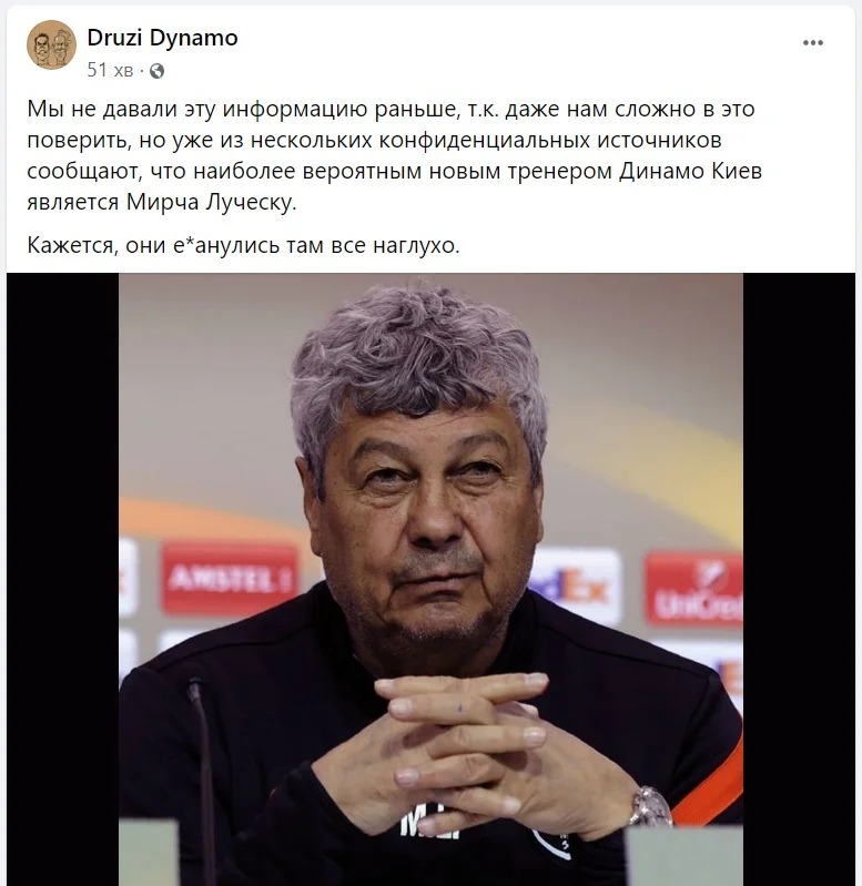 Такую информацию на своей странице в Фейсбуке сообщают Druzi Dynamo: "Мы не давали эту информацию раньше, потому что даже нам сложно в это поверить, но уже из нескольких конфиденциальных источников сообщают, что наиболее вероятным новым тренером Динамо Киев является Мирча Луческу".