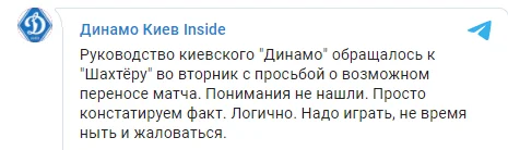 По сообщению Тelegram-канала Динамо Київ Inside, руководство лидера чемпионата во вторник, 3 ноября, обращалось к "оранжево-черным" с просьбой перенести матч на более поздний срок. Дончане отказались идти на уступки сопернику.