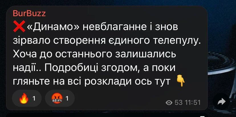"Динамо неумолимо и снова сорвало создание единого телепула. Хотя до последнего оставались надежды. Подробности скоро", – написал журналист в своем Telegram-канале. Ранее представители киевлян заявляли, что им не нравятся предложения и они готовы передать права на бесплатную трансляцию. Также среди критиков телепула были Рух, Заря и СК Днепр-1.