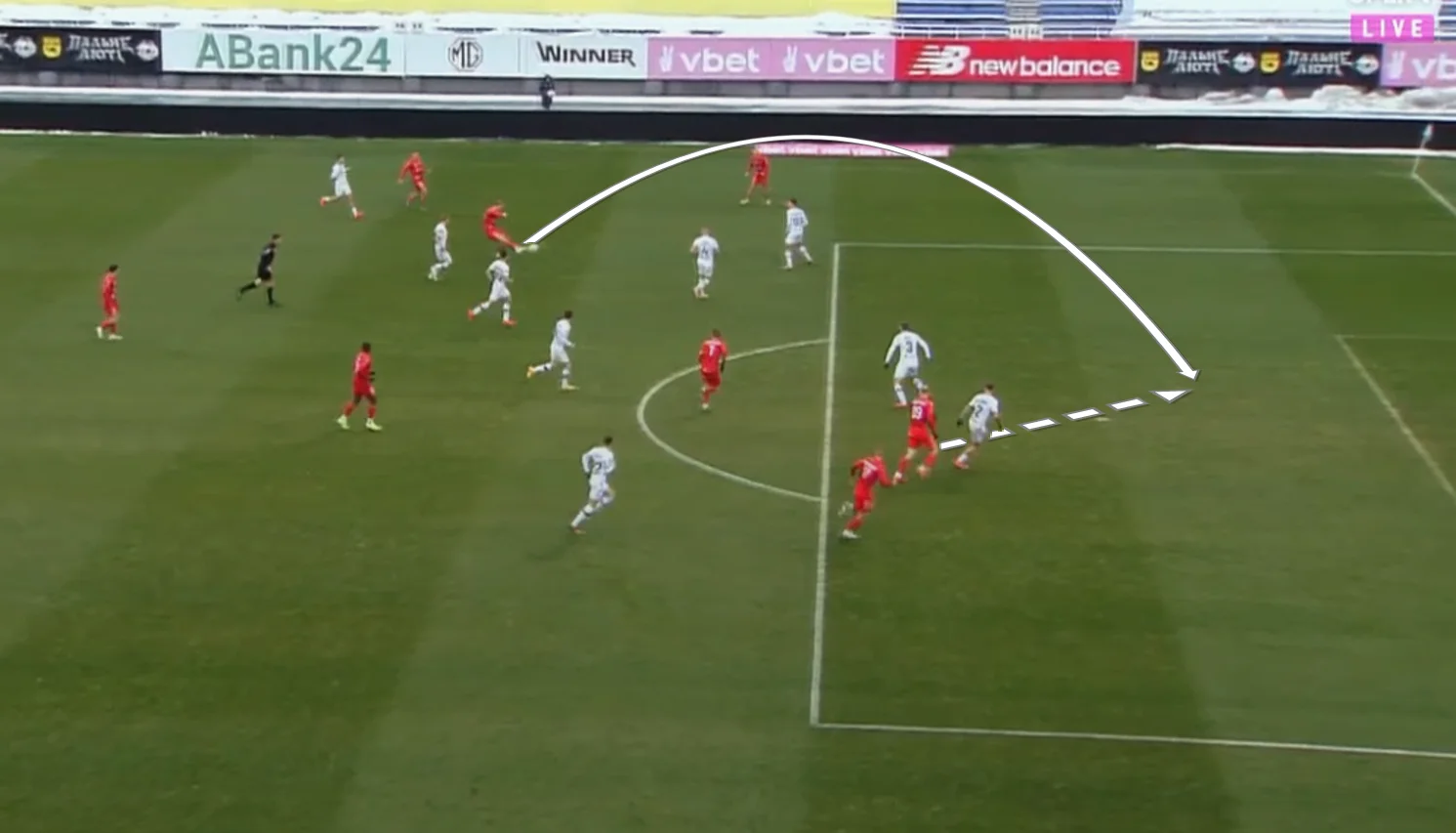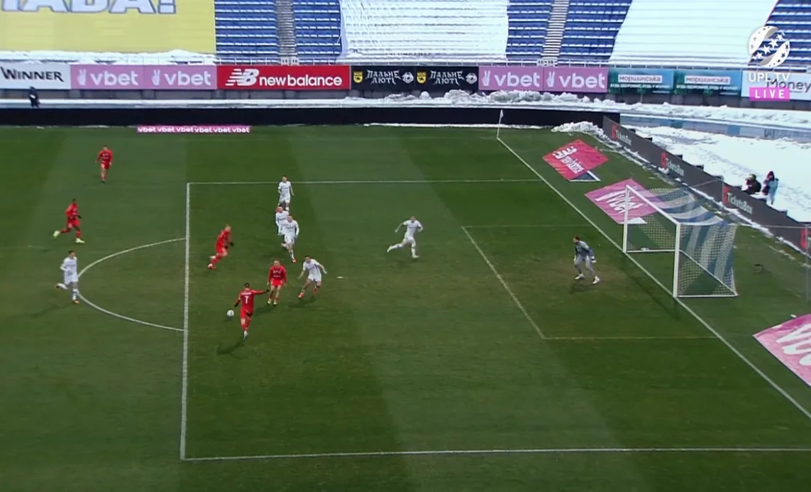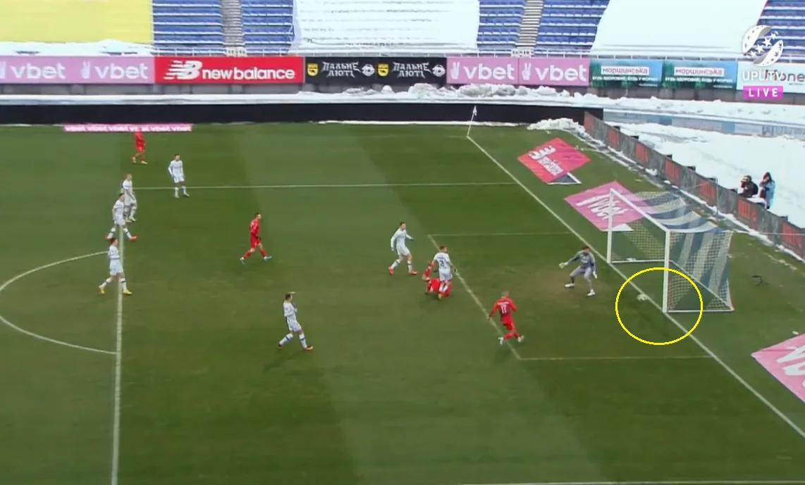Так, уже на 48-й минуте Дячук допустил две потери на своей части поля, после чего пошла заброска на ход Луану. Бразилец ворвался на правый угол штрафной и нанес плотный удар – впрочем, точно по позиции Бущана.
