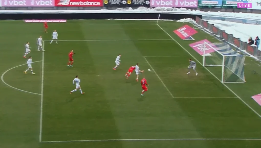 Гайдучик подхватил мяч и пробивал из пределов вратарской, но попал во внешнюю сторону сетки! "Бело-синие" капитально отскочили. В итоге, команды отправились отдыхать при минимальном преимуществе Динамо.
