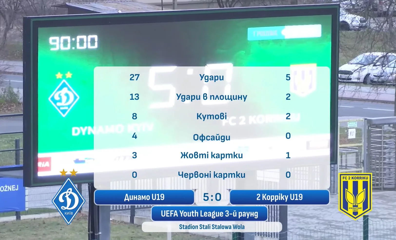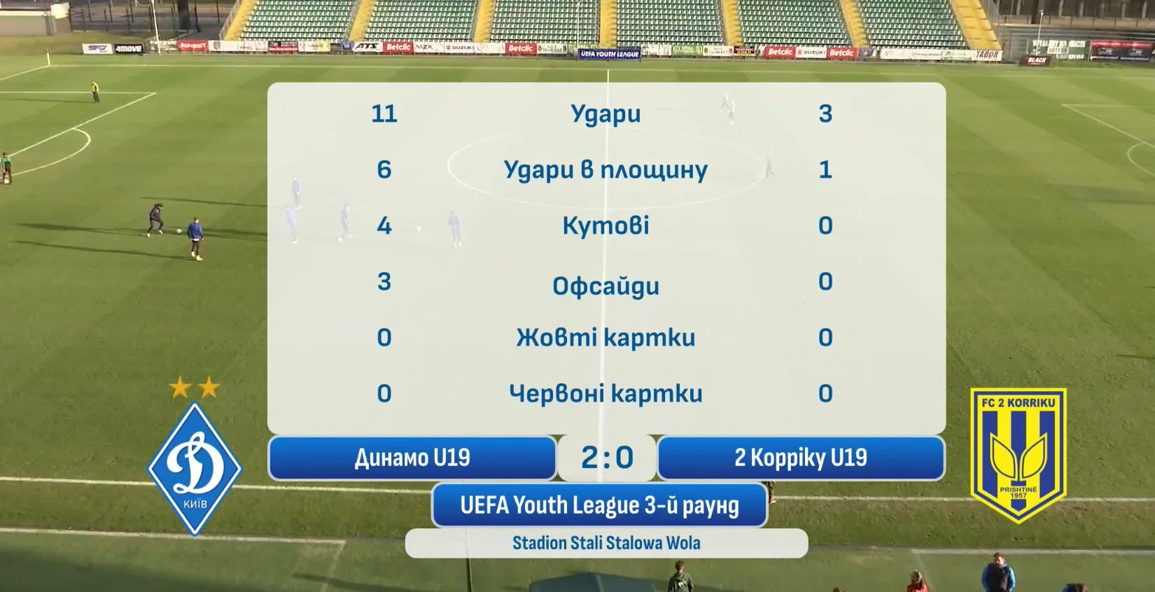 Суркис на выходе сбросил снаряд на соперника, но тут же исправился. Не могут косовары наказать динамовцев, хотя странные ошибки случаются. Пономаренко обвел соперника во вратарской и заработал пенальти. Сам же реализовал, есть хет-трик! Андрейко накрутил нескольких оппонентов и пробил метров с 20. Если бы еще вратарь не тащил, счет мог быть и двузначный. Ливень ударов украинцев на последних минутах, 5 гол не могут забить каким-то чудом. Однако избежать 5:0 не удалось гостям. Иван Андрейко таки положил с позиции левого вингера шедевральный голасо на 90+4. Как же закрутил! Ответный матч состоится 11 декабря.