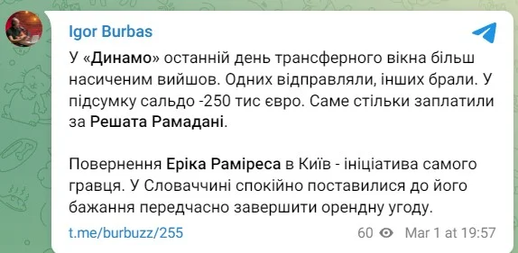 Переход Решата Рамадани обошелся Динамо в 250 тысяч евро, сообщает Бурбас в своем Telegram-каналы.