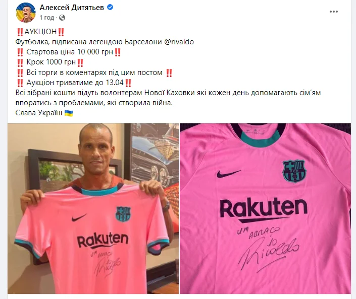 Защитник Краковии Алексей Дитятьев решил пожертвовать футболкой Барселоны с автографом легендарного форварда Ривалдо. Украинец выставил памятный артефакт на аукционе на своей странице в социальной сети Facebook.