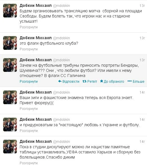 "Пока в студии дискутируют, можно ли нацистам памятные таблицы устанавливать, УЕФА оставило Харьков и сборную без болельщиков. Спасибо диким и придурковатым за "настоящую" любовь к Украине и футболу. Ваши зиги и фашистские знамена теперь вся Европа знает. Привет фюреру", - написал Михаил Добкин.