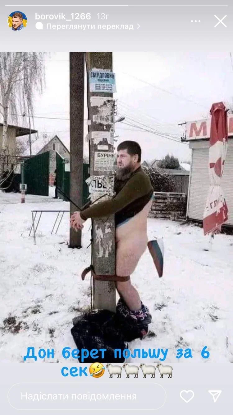 Боровик нашел фотожабу, на которой якобы Кадырова голым привязали к столбу. "Дон берет Польшу за 6 секунд", – подписал картинку 37-летний экс-голкипер, работавший в последнее время в тренерском штабе Черноморца.