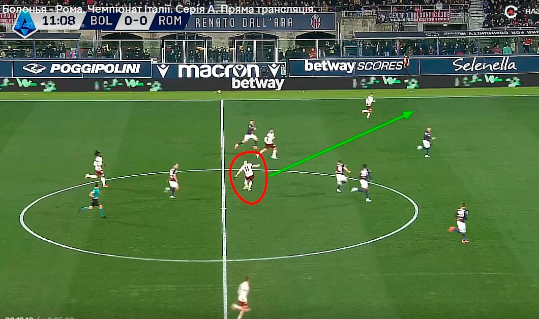 Болонья любит интенсивный футбол с высоким прессингом. Так что с первых минут Рома оказалась закрытой вокруг своей штрафной. Впрочем, гости из этого выжимали немного. В статистику пошел лишь удар (скорее даже пас) в руки Свилару. Без опасности, и в начальной стадии той атаки был офсайд.