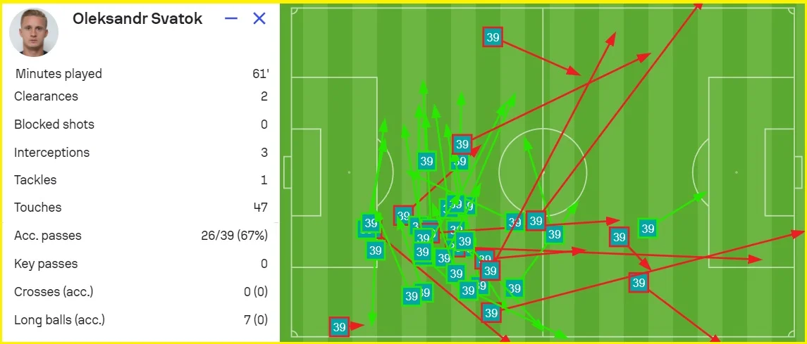 Было ясно заметно, что капитан физически не готов. Все попытки дальних передач в молоко – 0 точных из 7. Сваток просто не доставлял мяч в финальную треть. Как следствие – вторая самая низкая точность пасов в команде (67%). Ужас для центрального защитника.