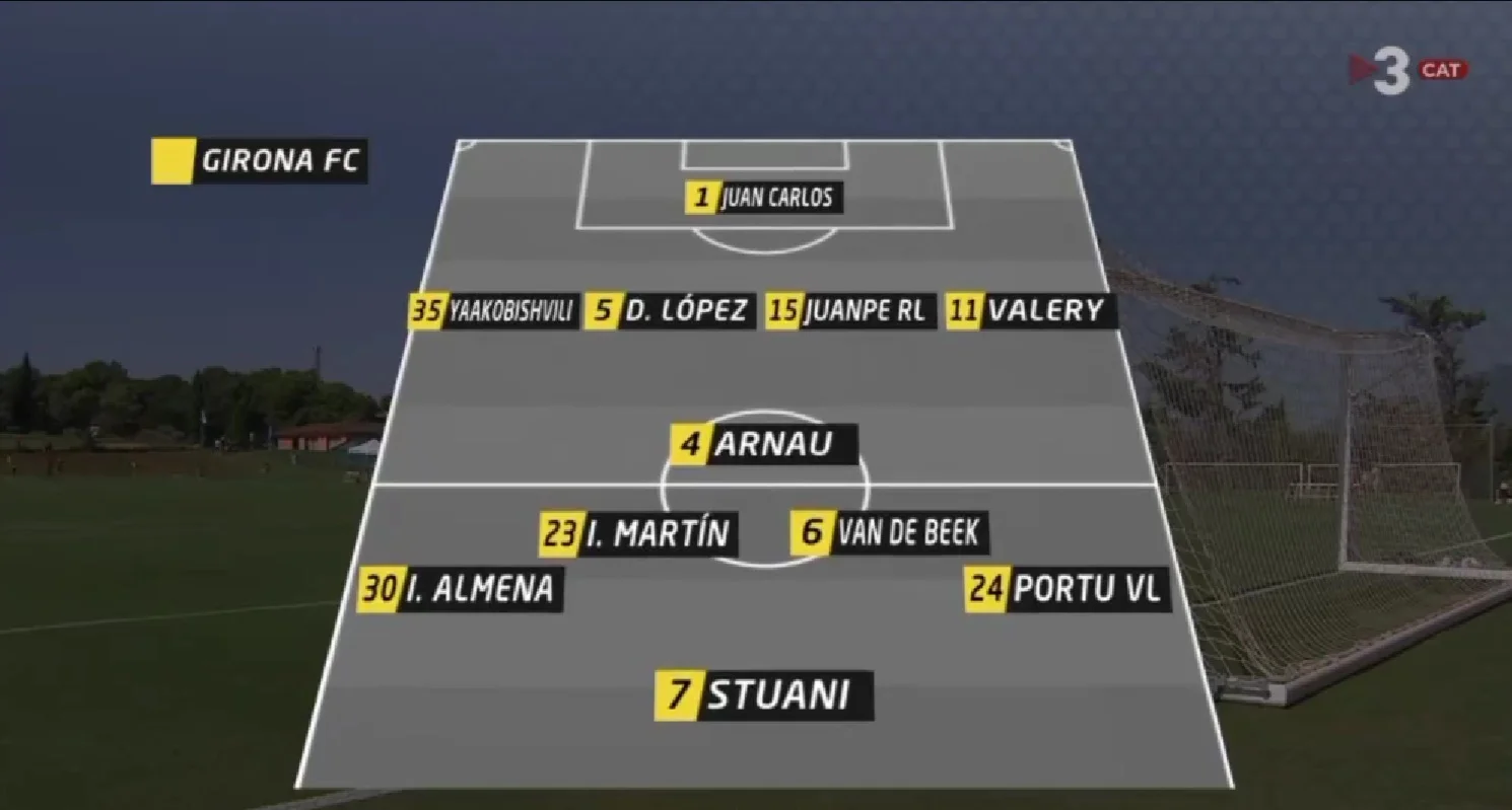 В стартовом составе каталонцев дебютировал "призрак" МЮ Дони ван де Беек, который пытается перезапустить собственную карьеру под руководством Мичела. Именно голландец придумал эффектную трехходовку с участием Валери и Порту, которая едва не завершилась голом Стуани. Уругвайский ветеран не сумел акцентировано пробить метров с 10-ти.