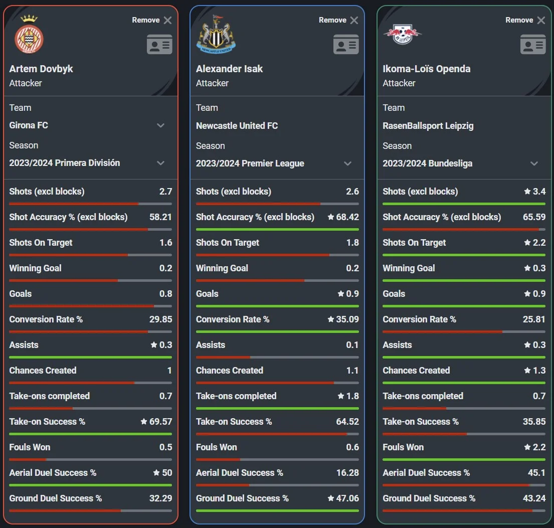 Сравнительная статистика Довбика с Исаком и Опенда в этом сезоне (на 90 минут): украинец лучше играет в воздухе и успешнее в дриблинге
