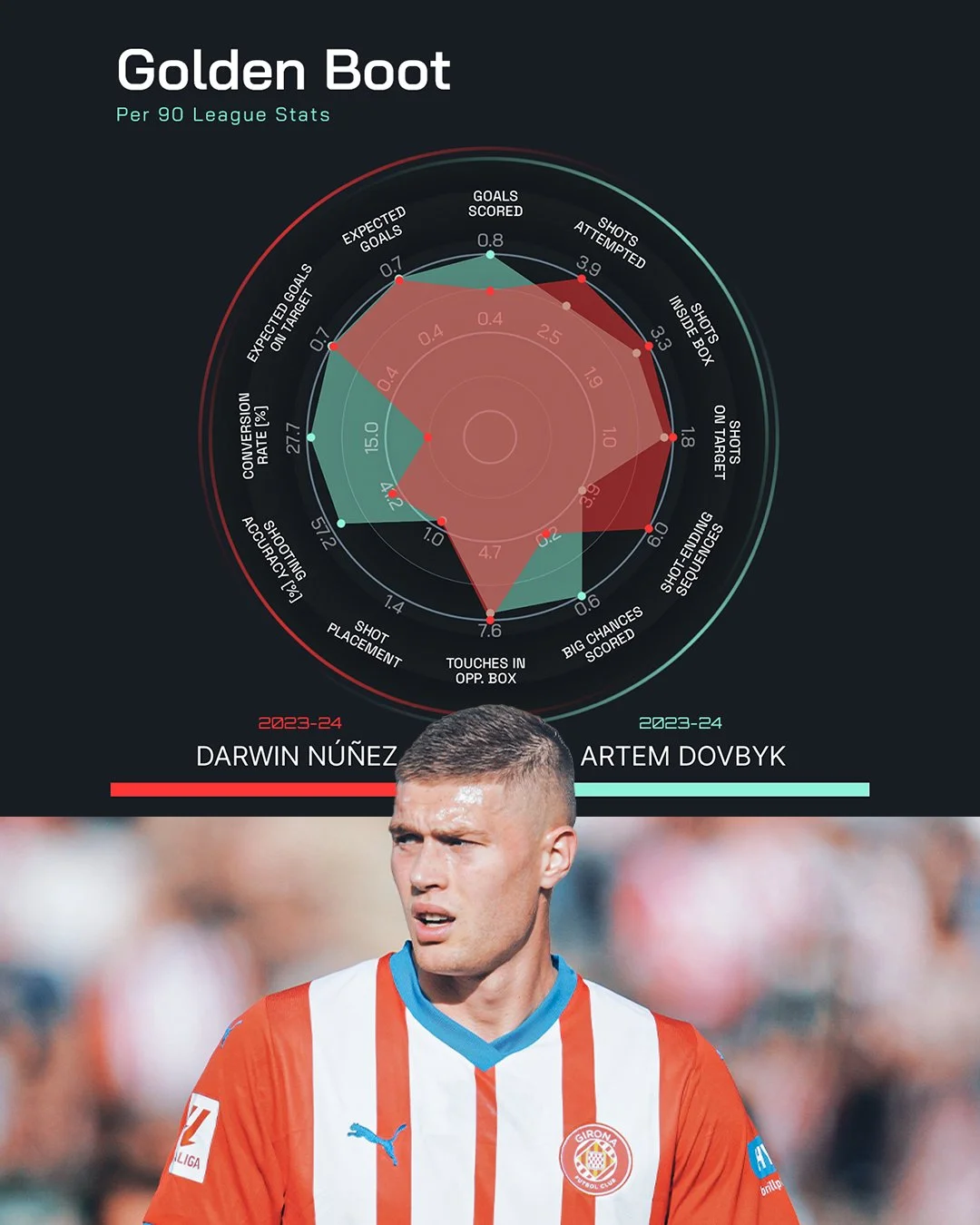 Довбик перешел в Жирону прошлым летом из СК Днепр-1. Украинец сразу может стать лучшим бомбардиром Ла Лиги. 20 голов Артема помогли команде впервые в истории выйти в Лигу чемпионов.