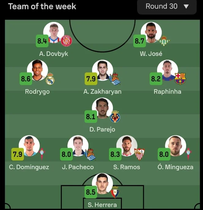 В полузащите нашлось место россиянину Артуру Захаряну. Также в команду недели попали Родриго, Рафинья и Дани Парехо. В обороне сразу 2 защитника Сельты – Оскар Мингеса и Карлос Домингес, а также Хон Пачеко и Серхио Рамос. Лучшим вратарем тура стал Серхио Эррера.