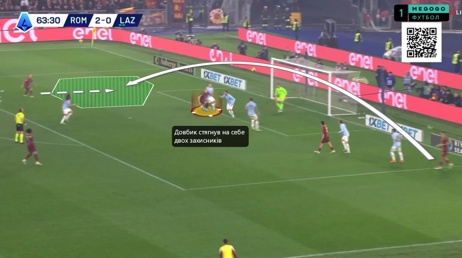 На 64-й минуте Довбик качественно поддерживал контратаку Ромы, открываясь в зонах завершения и стягивая на себя защитников. В итоге Артем помог открыть зону для Пеллегрини, однако его накрыли при попытке замыкания.