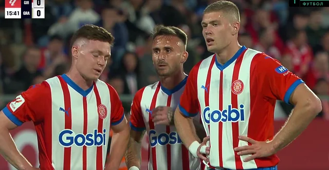 Жирона заработала штрафной. Обычно Довбик не претендует на эти стандарты, но на этот раз подошел "составить конкуренцию" Цыганкову и Алейшу.