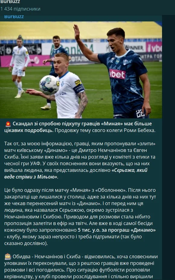 Они передали свои заявления в Комитет по этике и честной игре УАФ, в которой отметили, что лицо, которая предлагала им сдать матч против "бело-синих" – "Сережа, который ведет стримы с Милей". Произошло это сразу после матча Миная с Оболонью – человек, который назвался Сережей, отдельно встретился с Немчаниновым и Скибой.