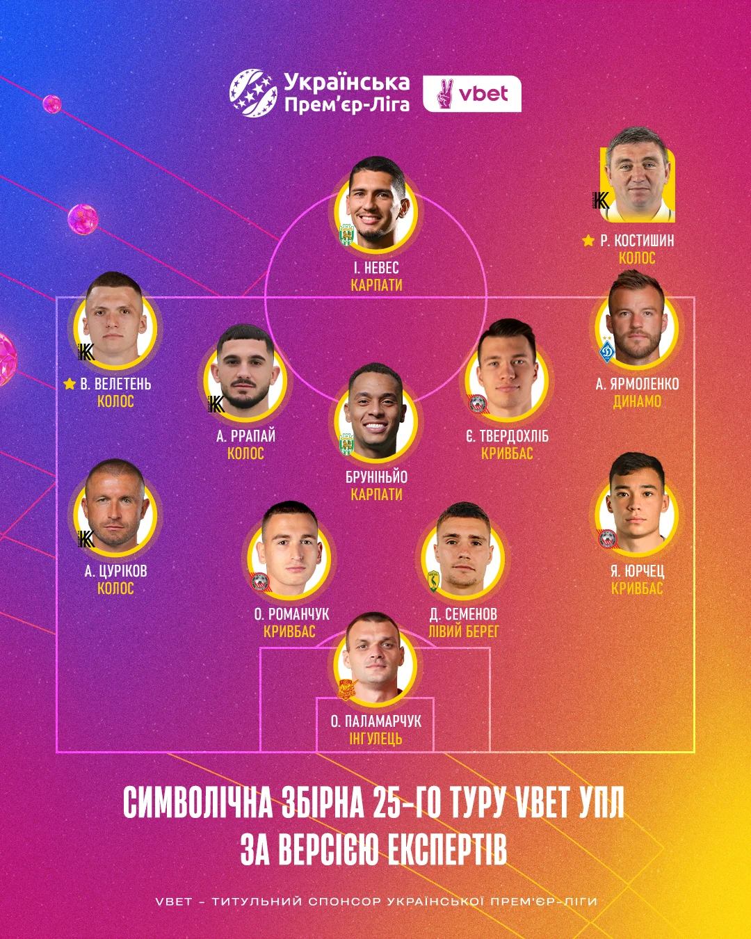 Символическая сборная 25-го тура УПЛ выглядит следующим образом: Паламарчук – Юрчец, Семенов, Романчук, Цуриков – Ррапай, Бруниньо, Твердохлеб – Ярмоленко, Невеш, Велетень.