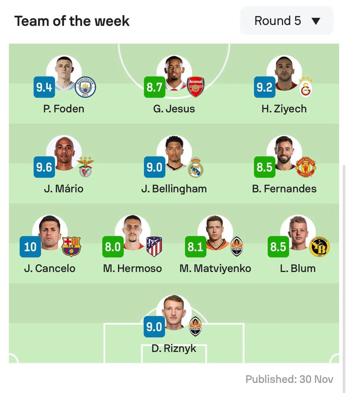 Статистические порталы назвали топ-11 игроков очередного тура Лиги чемпионов.