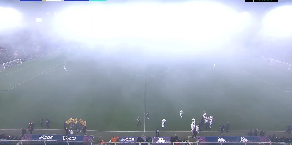 Старт игры прошел в крайне низком темпе. Среди моментов – слабый удар Тюрама головой, который не составил никаких проблем для Мартинеса. Вместо футболистов на первый план вышли тифози Дженоа, устроившие дымовую завесу на Луиджи Феррарис. Арбитр решил убрать команды с поля на 17-й минуте. Пауза продолжалась минут 5, а после возобновления игры Интер снова создал полумомент – Мартинес забрал мяч после неудачного удара Арнаутовича.
