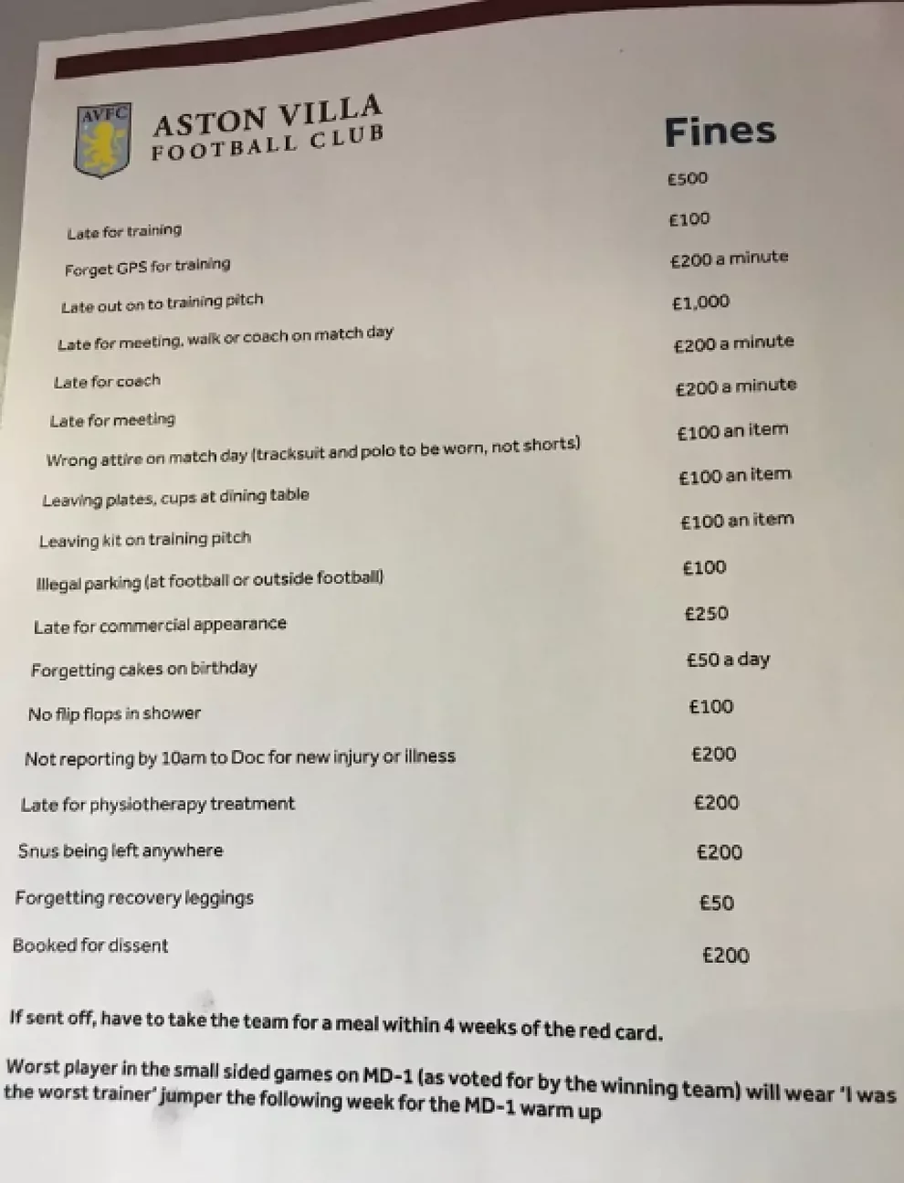 – опоздание на командную встречу, прогулку или тренерскую установку – 1000 фунтов (дополнительные 200 фунтов за каждую минуту задержки);