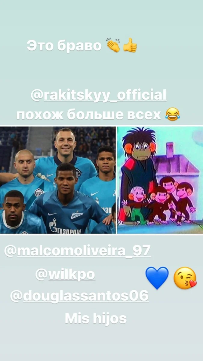 Нападающий Зенита поделился фотоколлажем, на котором он вместе с Ярославом Ракицким и темнокожими легионерами питерского клуба позируют перед матчем. Рядом с фото был мультипликационный кадр с обезьянами.