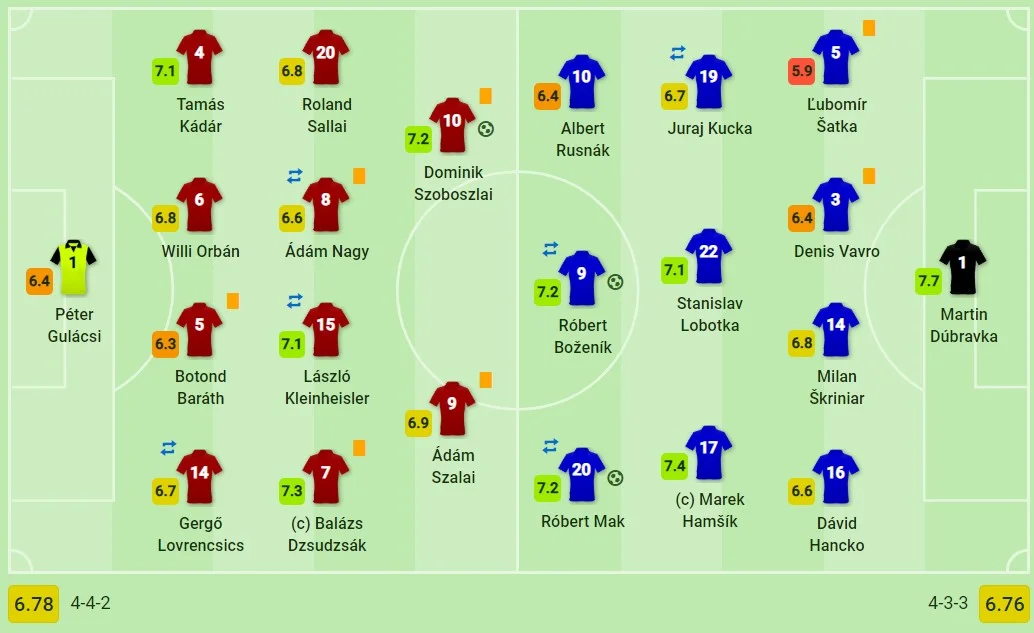 На гол Мака венгры ответили классным ударом со штрафного от юного таланта Собослаи, а вот взятия ворот от Боженика стало победным для Словакии. Тамаш Кадар закрыл позицию левого защитника сборной Венгрии. Оба гола соперника пришли с его фланга – защитник Динамо точно мог сыграть более агрессивно. Впрочем, оценка у него неплохая – 7.1. Это третий показатель в команде.