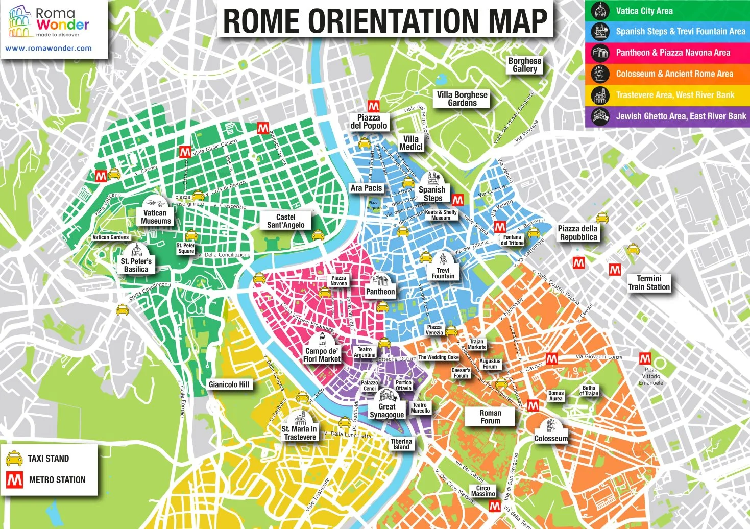 Что касается районов для проживания, то с точки зрения доступности до всех мест целесообразно поселиться в районе вокзала Termini (правда, вокзал – он и в Риме вокзал, соответствующая атмосфера и асоциальные элементы присутствуют и здесь). Оптимальным является вариант жилья вблизи Колизея или площади Испании (Piazza di Spagna), однако цены откровенно "кусаются". На карте выделены лучшие районы проживания для гостей города.