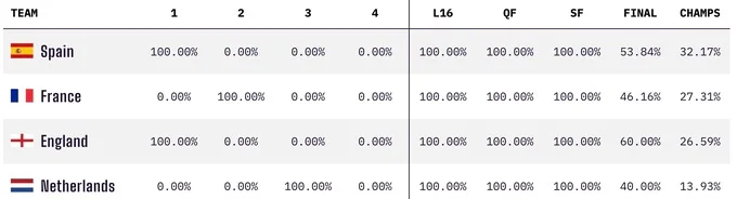 Главным фаворитом на золото Евро-2024 является сборная Испании – ее шансы оцениваются в 32,17%. Далее идет Франция – 27,31% и Англия – 26,59%. Откровенным аутсайдером в этом квартете считаются Нидерланды – лишь 13,93%.