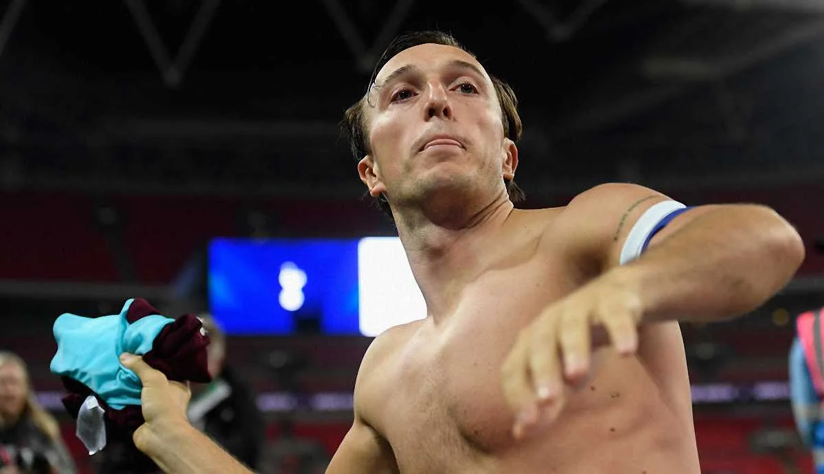 Капитан Вест Хэма Марк Нобл после финального свистка подошел к трибунам, чтобы поблагодарить фанатов и подарить одному из них свою футболку.