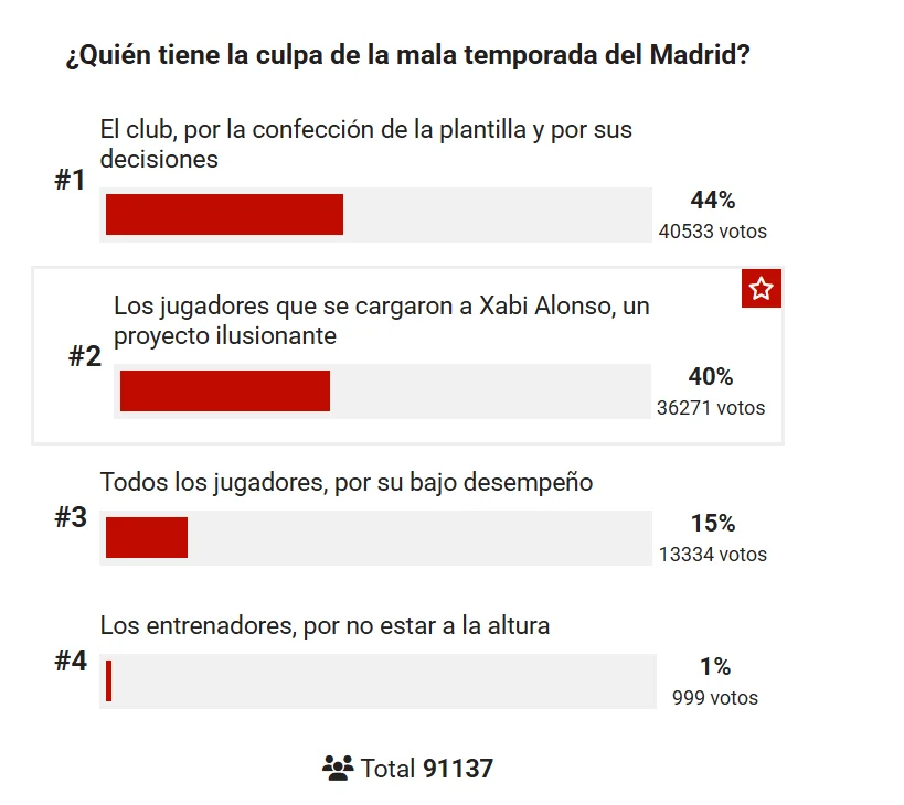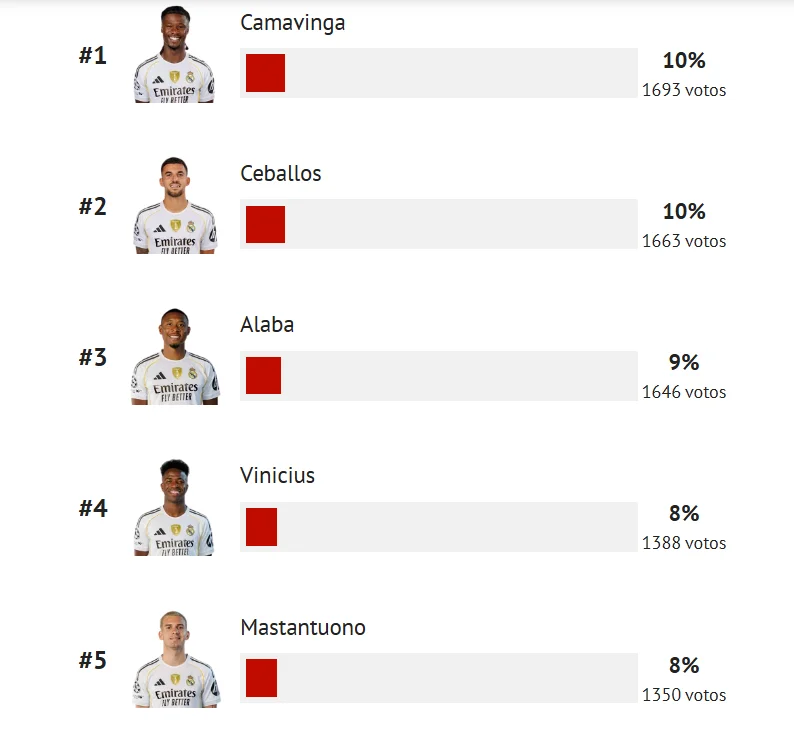 Первый вопрос касался игроков, которые должны покинуть команду. Первое место в списке кандидатов на выход занял Эдуардо Камавинга (10%). Второе место у Дани Себальйоса (10%), а тройку замкнул Дэвид Алаба (9%). Четвертое место занял звездный Винисиус Жуниор (8%).