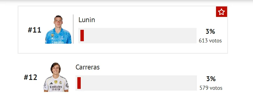 Андрей Лунин оказался на 11-м месте в этом опросе – 3% опрошенных хотят, чтобы украинец ушел из Реала.