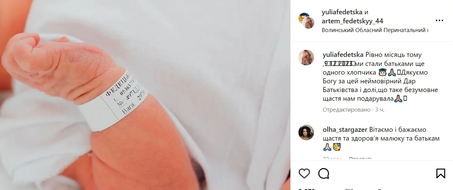 "Ровно месяц назад, 9 декабря 2023 года, мы стали родителями еще одного мальчика. Благодарим Бога за этот невероятный Дар Отцовства и судьбу, что такое безусловное счастье нам подарила", – написала Юлия под фотографией хрупкой ручонки.