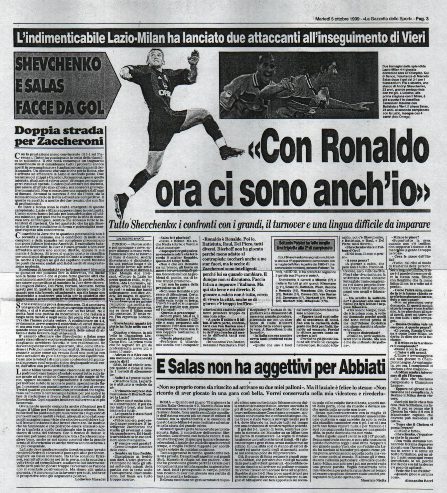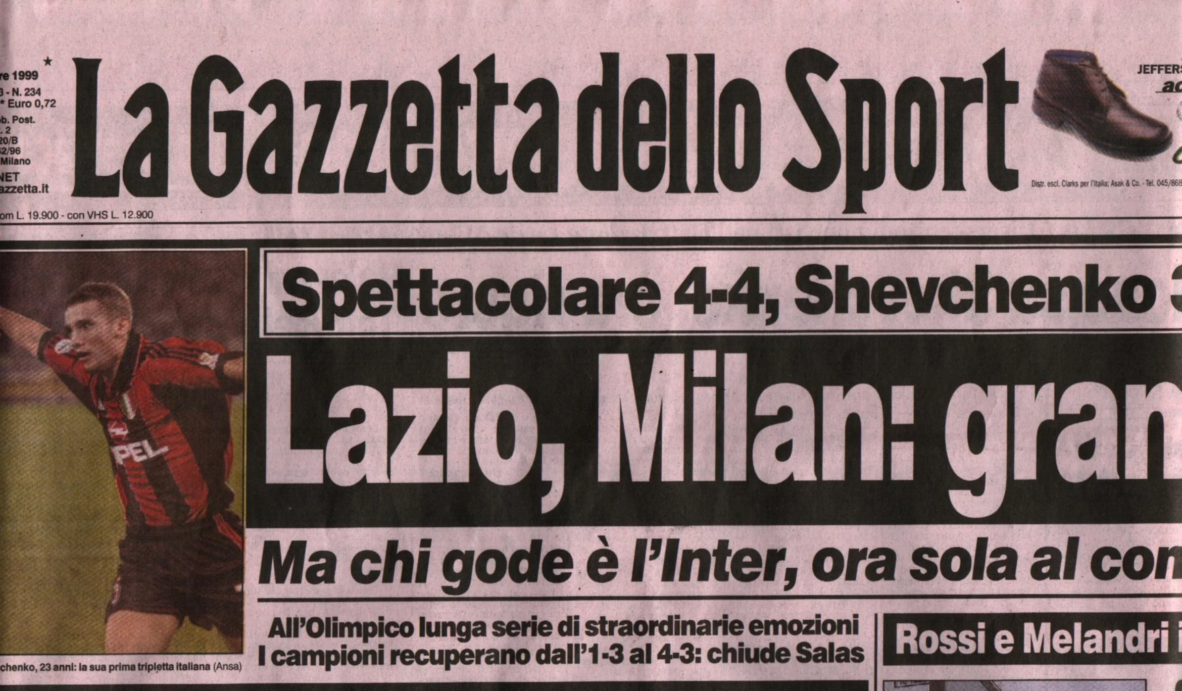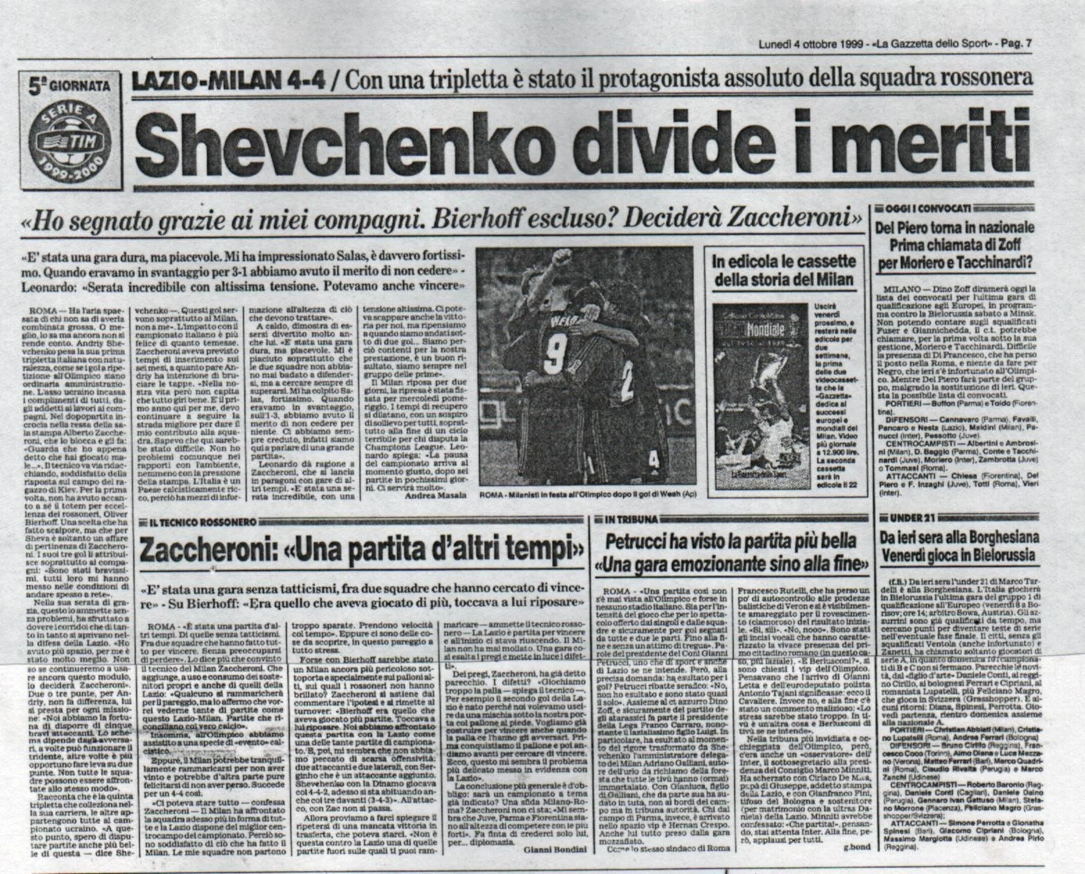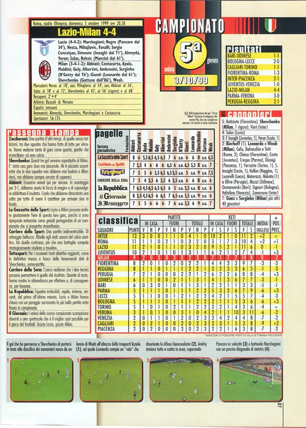Спроба Дзаккероні засушити, випустивши на 86 хвилині замість Шевченка Гаттузо, ледь не обернулася повним провалом. Лаціо того сезону таки взяв Скудетто, яке не зовсім справедливо втратив у 1998/99, на 1 бал поступившись Мілану. Шева зробив свій перший хет-трик на Апеннінах. Впорався за 25 хвилин, не рахуючи виходу на перерву. Лаціо став другою найулюбленішою командою українського бомбардира – 13 голів за 18 матчів. Лише Інтеру забивав більше, але там 15 м'ячів за 22 поєдинки, а різницю зробили дербі в ЛЧ. Причому особливо наш голеадор феєрив у Римі, де наколотив "орлам" 7 голів з 9 влучань у рамках Серії А.