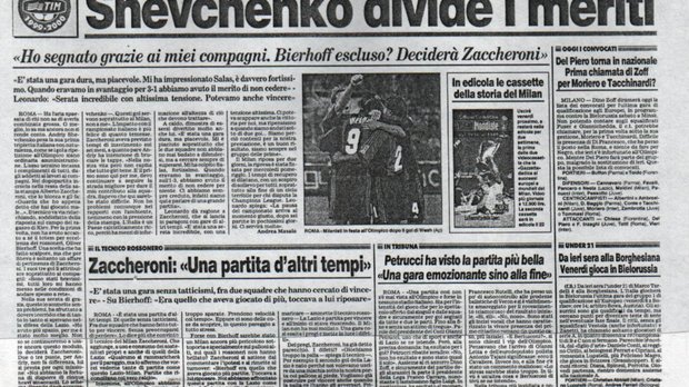 Італійські ЗМІ переповідали, що тоді Олімпіко аплодував Шевченку. Справді професійний і амбітний не на словах, а в роботі, українець не мусив просити оцих всіх: "Дайте мені час". Забити у своєму дебютному матчі за Мілан. В один з перших місяців у все ще доволі закритій та стриманій топ-лізі з найкращими захисниками зробити таке з останнім переможцем Кубка володарів кубків... Там команда Ерікссона, до слова, здолала Мальорку Ектора Купера, який через рік помститься золотому Лаціо у плей-офф ЛЧ, але знову програє єврокубковий фінал.