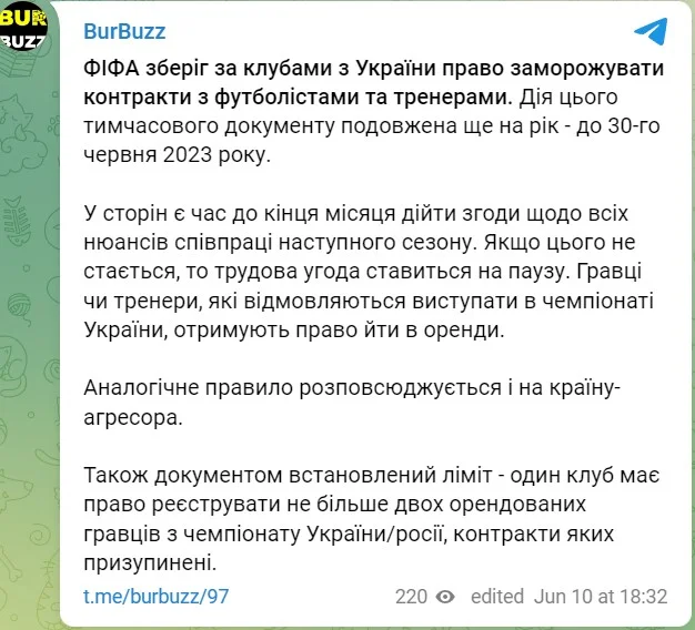 ФИФА решила продлить действие документа до 30 июня 2023 года, информирует Игорь Бурбас в своем Telegram-канале. Стороны должны до конца месяца определиться о будущем сотрудничестве. Если согласия не удается достичь, то сделка замораживается, а игрок или тренер вправе уйти в аренду в другой клуб. Добавим, что это самое правило действует и на игроков, выступающих в российском первенстве.