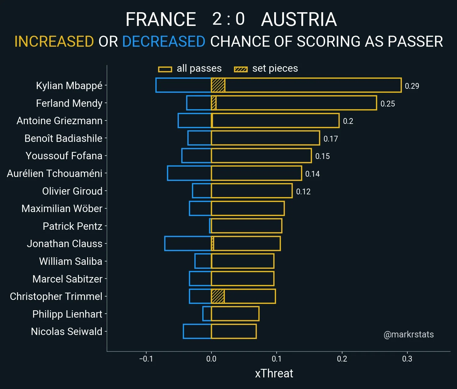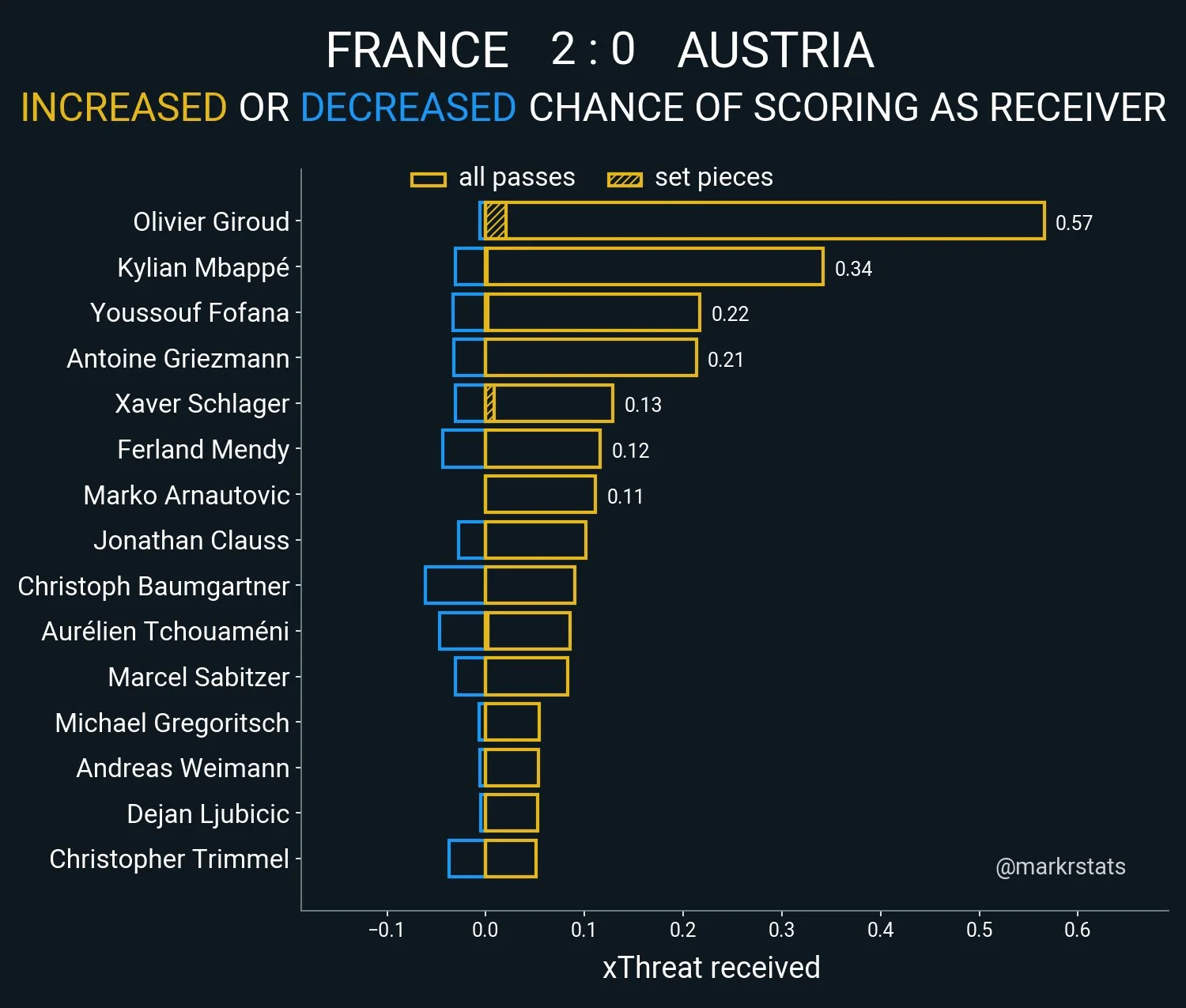 По показателю остроты принятых передач Жиру лидирует с огромным отрывом. Его открывания приносили Франции колоссальную пользу.