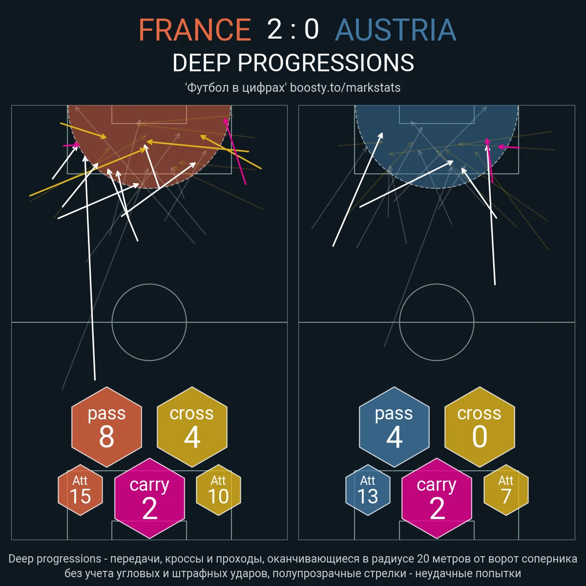С оборонительной работой все также было ужасно. Прессинга де-факто не существовало (на одно оборонительное действие за центральным кругом приходилось более 16 пасов французов), а борьбу проиграли тотально – 29:53 на земле, 9:14 в воздухе. Хозяевам позволили провести 22 удара по воротам (15 из пределов штрафной), 17 продвижений в район штрафной и 37 владений по 10+ передач.