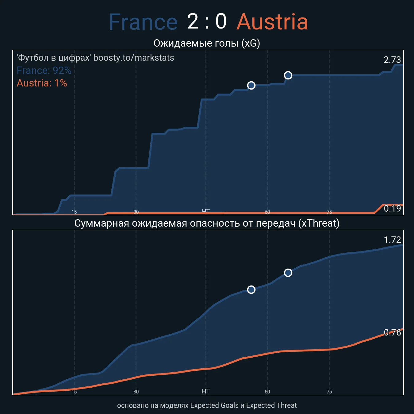 С такой статистикой подопечные Дидье Дешама должны были громить соперника, но что мы увидели по факту? Франция выдала мощный старт в обоих таймах и имела короткую вспышку активности в середине первого. Да, xG высокий (наиграла на 2,73 ожидаемых гола), но на графике заметно, что реально топовых моментов было всего три. Реализовалить же удалось неочевидные эпизоды, причём гол Мбаппе полностью можно списать на гений Килиана.