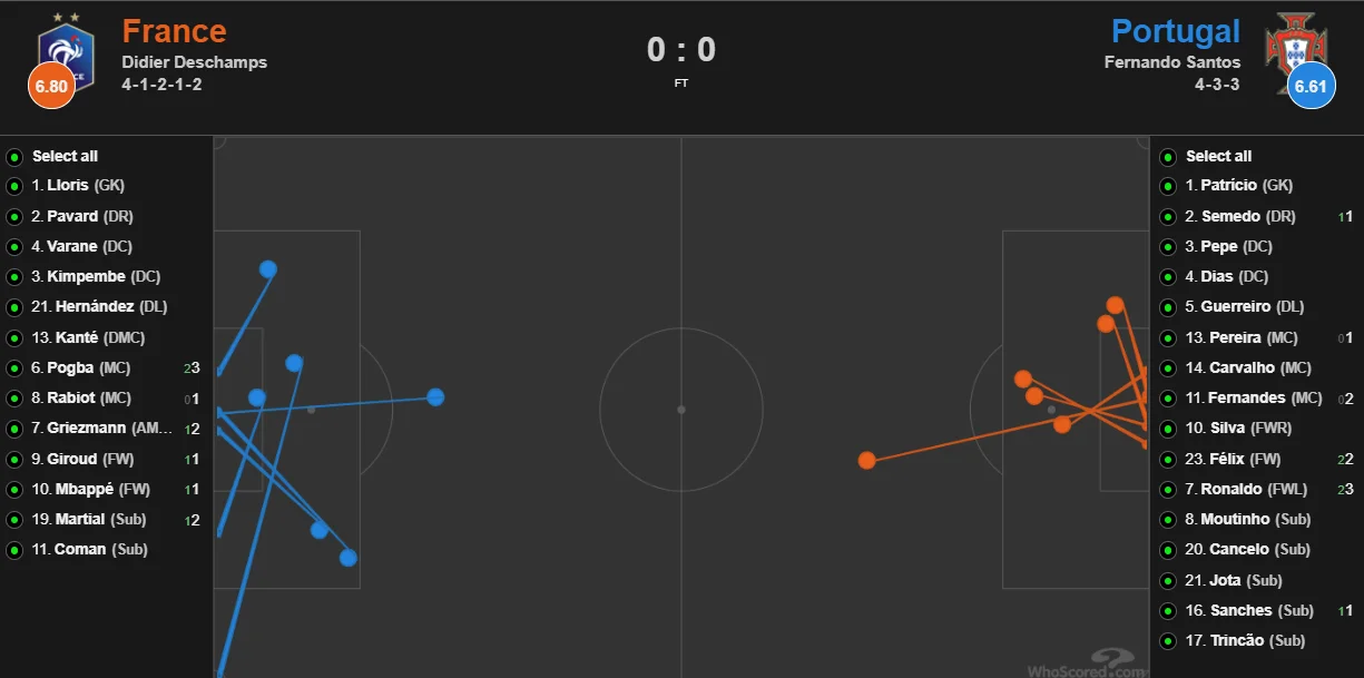 Карта ударов показывает, насколько ужасные позиции имели форварды обеих сборных – и это только незаблокированные выстрелы. Все моменты, где удавалось пробить из центра штрафной, кроме ударов Жиру и Криштиану, оказались сумбурными и очень неточными.