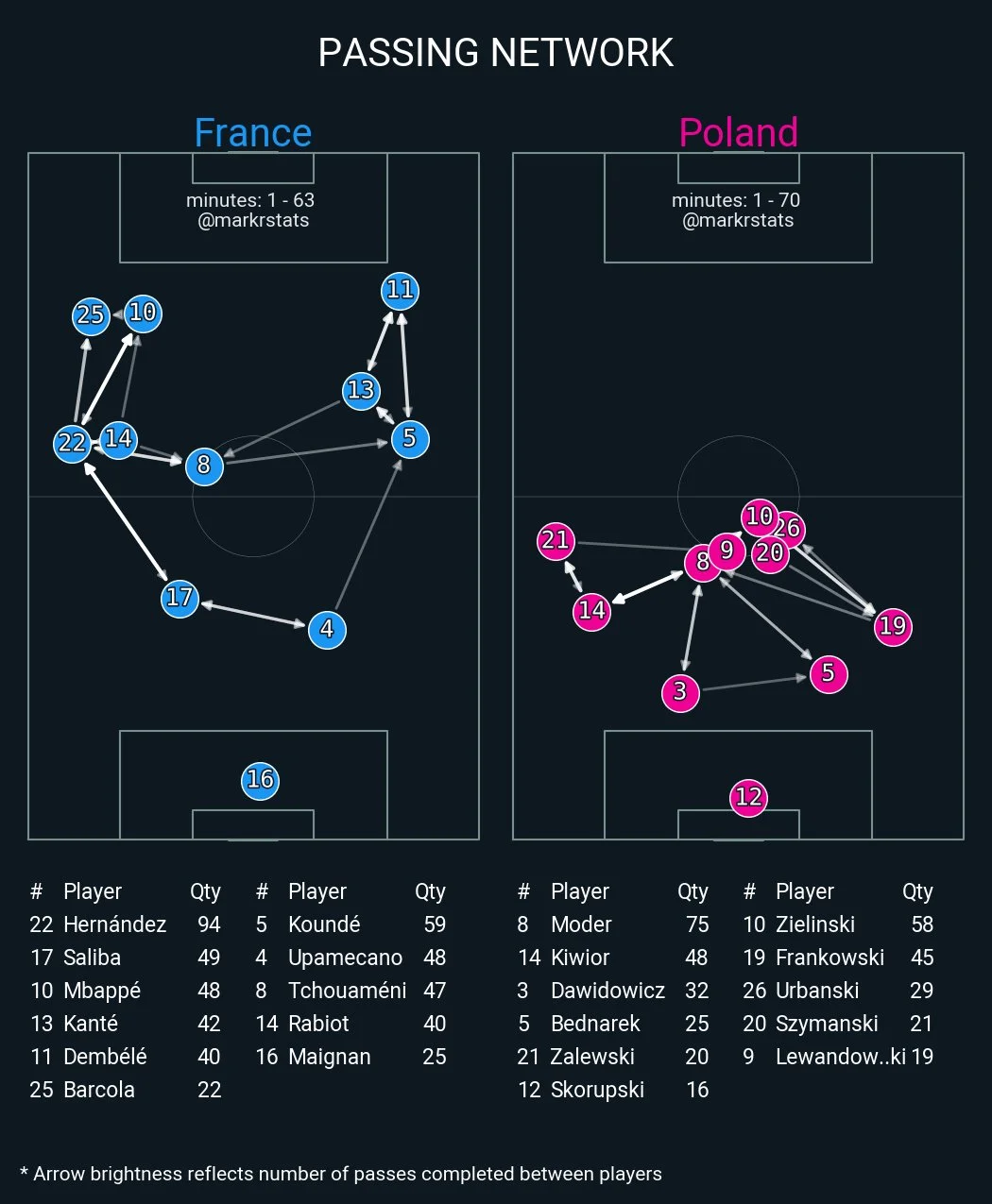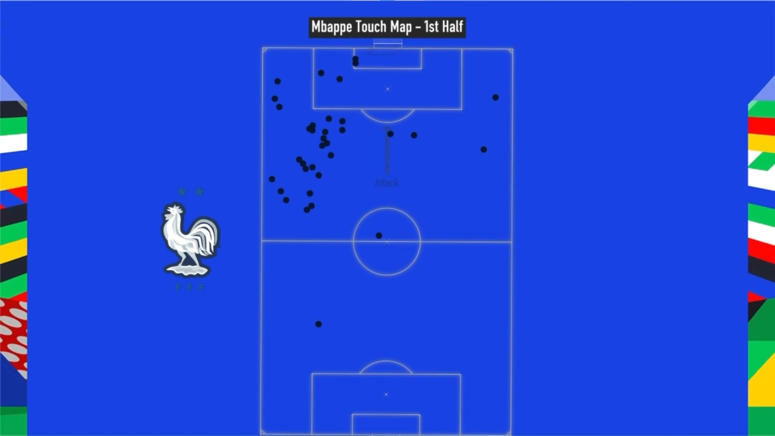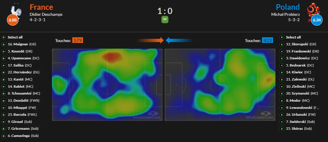 Большую часть матча фланговая игра была сбалансированной, однако в последние 10 минут первого тайма Дидье Дешам решил поставить на Мбаппе. Команда создавала перегрузку на левом краю и крутила комбинации с Килианом – количество его касаний к мячу резко подскочило вверх.