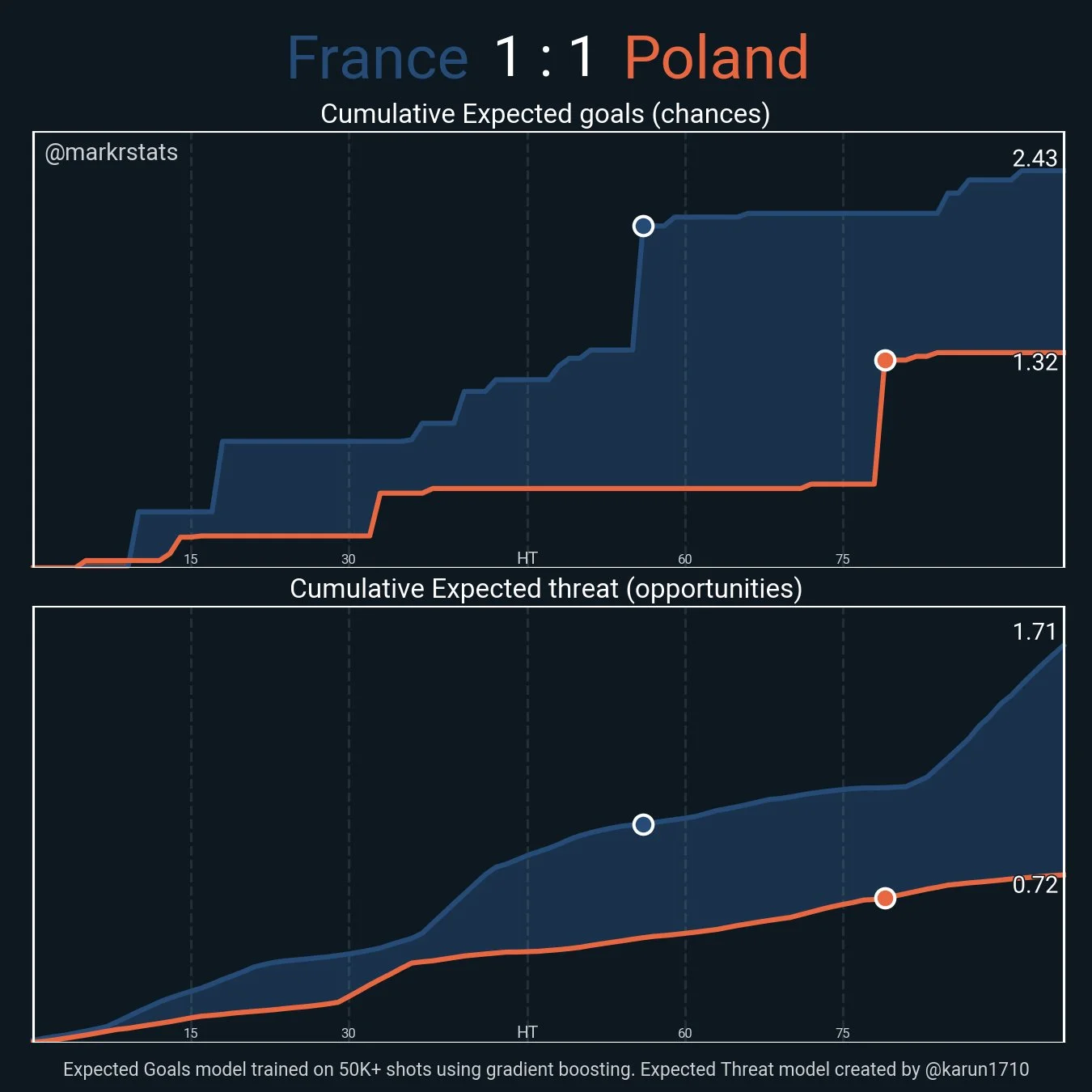 Нельзя сказать, что сборная Франции в таком режиме прямо таки разрывала поляков. Моментов возникало мало. Впрочем, свои три голевых возможности до перерыва команда создала – "Кадри" вполне могла потерпеть разгром, если бы не голкипер Скорупски.