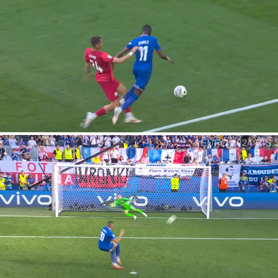 После перерыва давление сборной Франции достигло пиковых показателей. "Ле Бле" организовывали опасные атаки с врываниями в штрафную едва ли не ежеминутно. В конце концов, такой футбол вылился в пенальти на Дембеле – Усмана сбил Кивиор (хотя Усман ну очень уж подрисовывал).