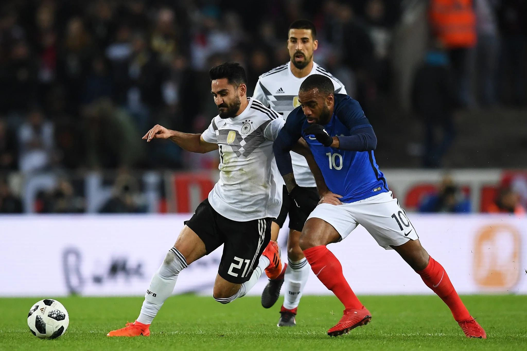 Сборная Германии 26 раз в истории играла в Кельне, где одержала 18 побед. Началу матча предшествовала минута молчания – присутствующие почтили память Ганса Шефера, легендарного нападающего местных "козлов", чемпиона мира 1954 года. Йоахим Лев поставил в старт не слишком убедительного в последнее время Месут Озила, а Дидье Дешам оставил на замене Гризманна. Первый тайм вполне закономерно остался за гостями. Ляказетт должен был забивать на 19 минуте, но реакция Траппа спасла "бело-черных". На 32 минуте голкипер ПСЖ парировал неприятный удар одноклубника Мбаппе. Буквально через мгновение Мартиаль без проблем обыграл Зюле и отдал на Ляказетта – нападающему английских "канониров" оставалось не промахнуться в пустые ворота.