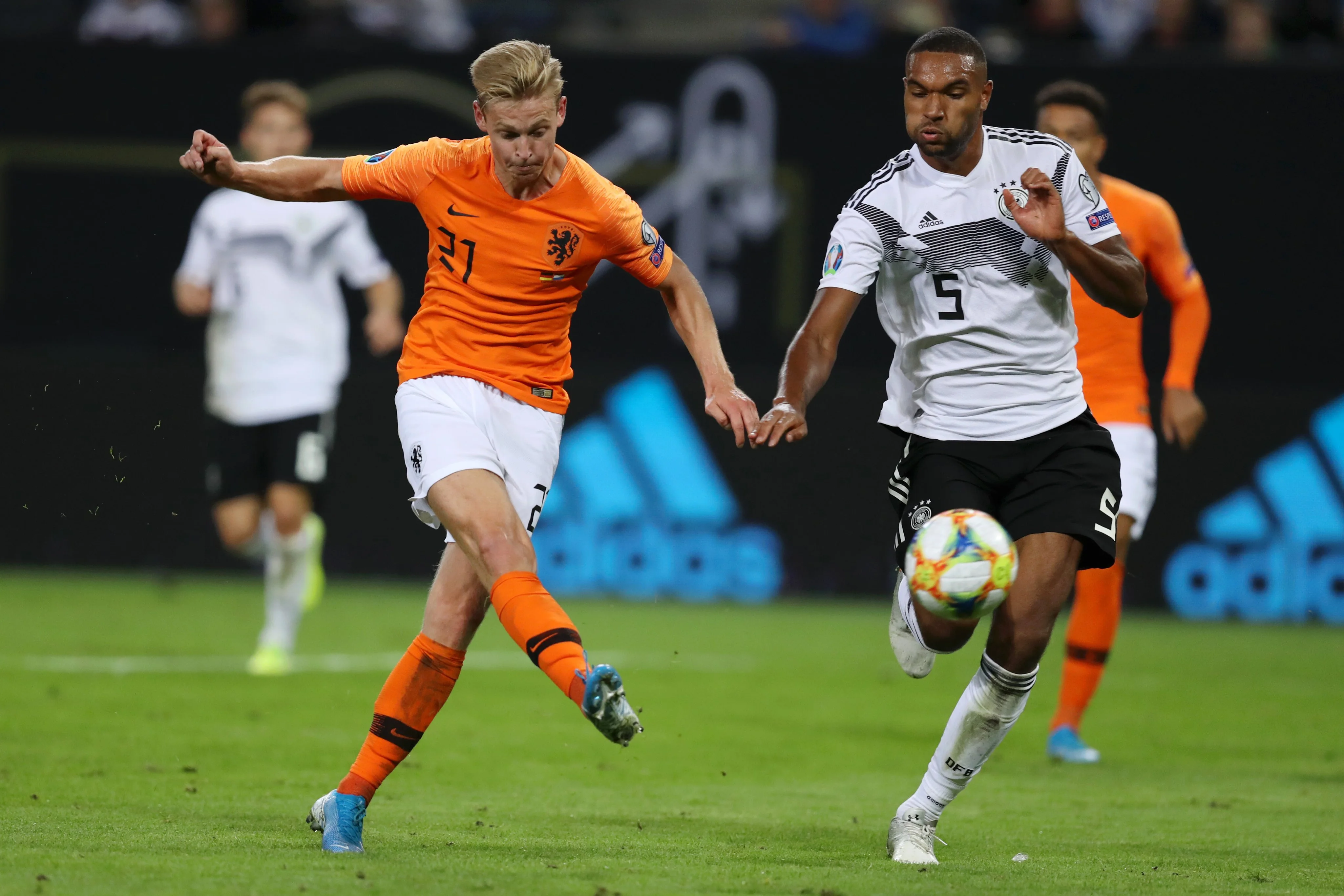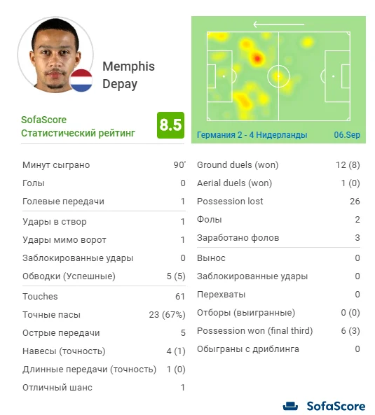 Также следует отметить Райана Бабела и Фрэнки Де Йонга. Первый разорвал оба фланга сборной Германии, выполнив 2 передачи под удар, классно прострелил на Депая на 57-й минуте (он сразу сбросил мяч под выстрел Вейналдуму) и, наконец, стал причастным к двум голам – первый из них произошел после его ассиста, а перед вторым Райан не только опередил защитника, но и избежал офсайда (впрочем, за него забил Та). Фрэнки же прекрасно дирежировал центром поля, отдав 2 паса под удар, выполнив 7 точных длинных передач с 8 попыток и дважды обыграв соперника на дриблинге (с трех попыток). В конце концов, и гол у него получился очень качественным – Де Йонг заметил щель в обороне, опередил Шульца и элегантно уложил Нойера. Мастер.