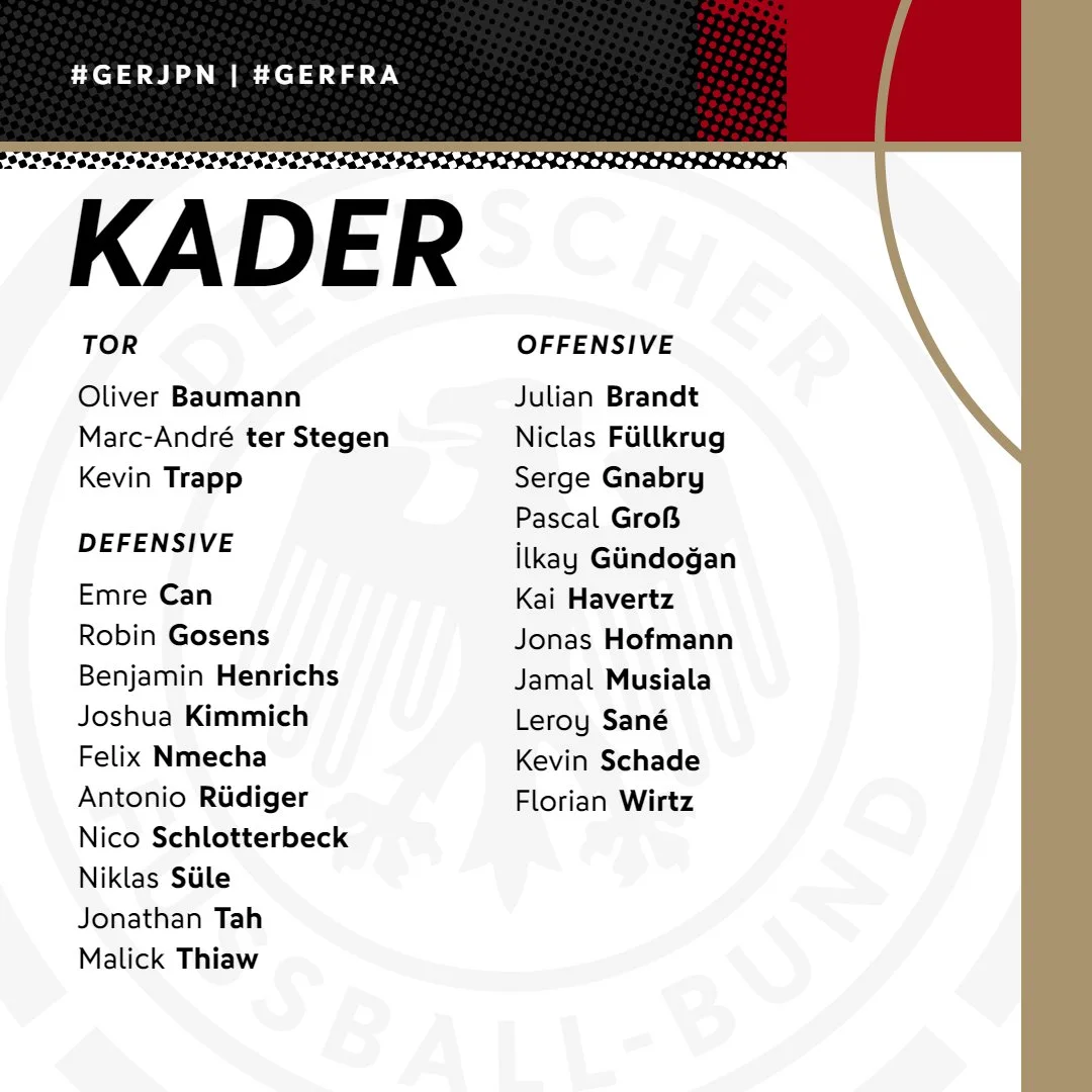 На матче против Японии (9 сентября) и Франции (12 сентября) не вызвали центрбека Тильо Керера (его заменит Никлас Зюле, которого игнорировали два предыдущих раза). Мануэль Нойер только что вернулся после травмы, поэтому его пока нет. Большой неожиданностью стало отсутствие Леона Горецки и Тимо Вернера. Флику даже пришлось объяснять свое решение.