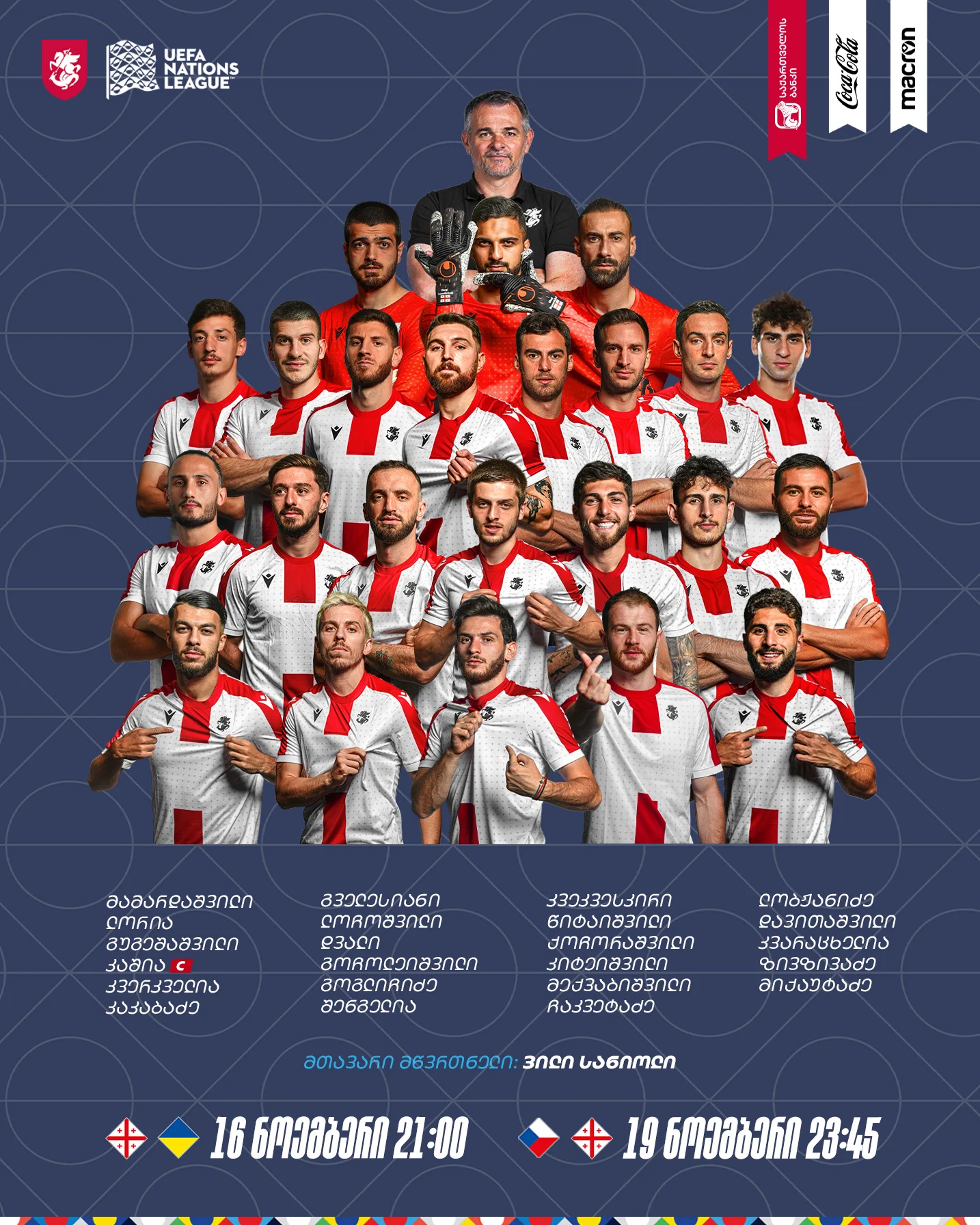 Стоит отметить присутствие в заявке вингера Динамо Георгия Цитаишвили, который на правах аренды выступает за испанскую Гранаду, и защитника Шахтера Георгия Гочолейшвили, одолженного датскому Копенгагену. Зато отсутствует в списке Шота Ноникашвили из ЛНЗ, который вызывался Саньйолем на октябрьские матчи.