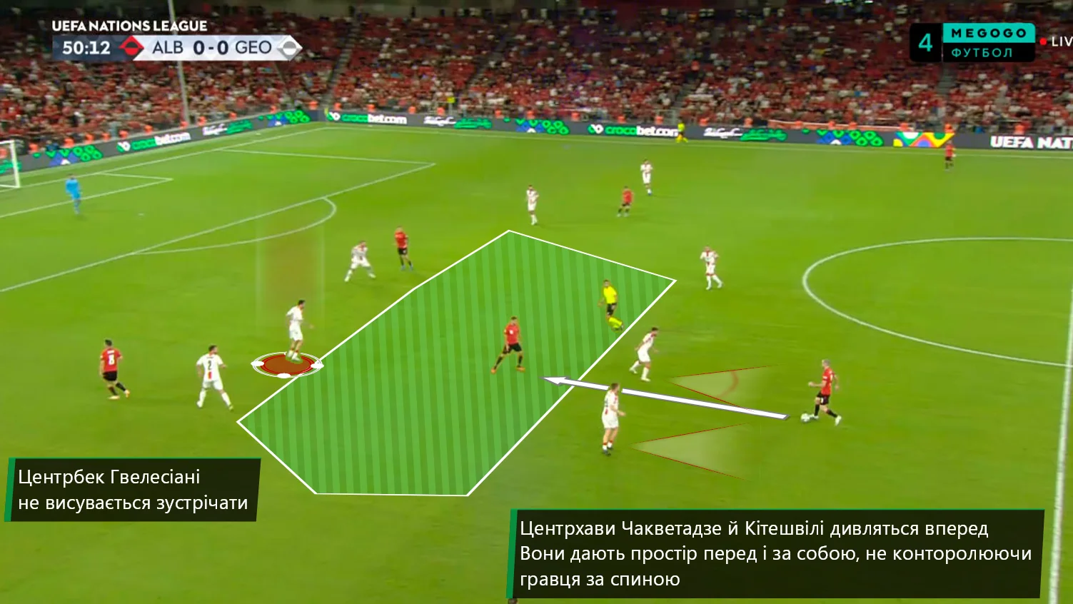 Хвича и Микаутадзе способны создать разницу в отдельных эпизодах, но глобально Грузия задыхается без пространства в атаке. При этом в обороне пространство контролируется слабо – центрхавам Сакартвело не хватает концентрации и слаженности во взаимодействии с обороной. Разрывов в линиях кавказцев хватает, чем пользовались и Албания, и Украина.