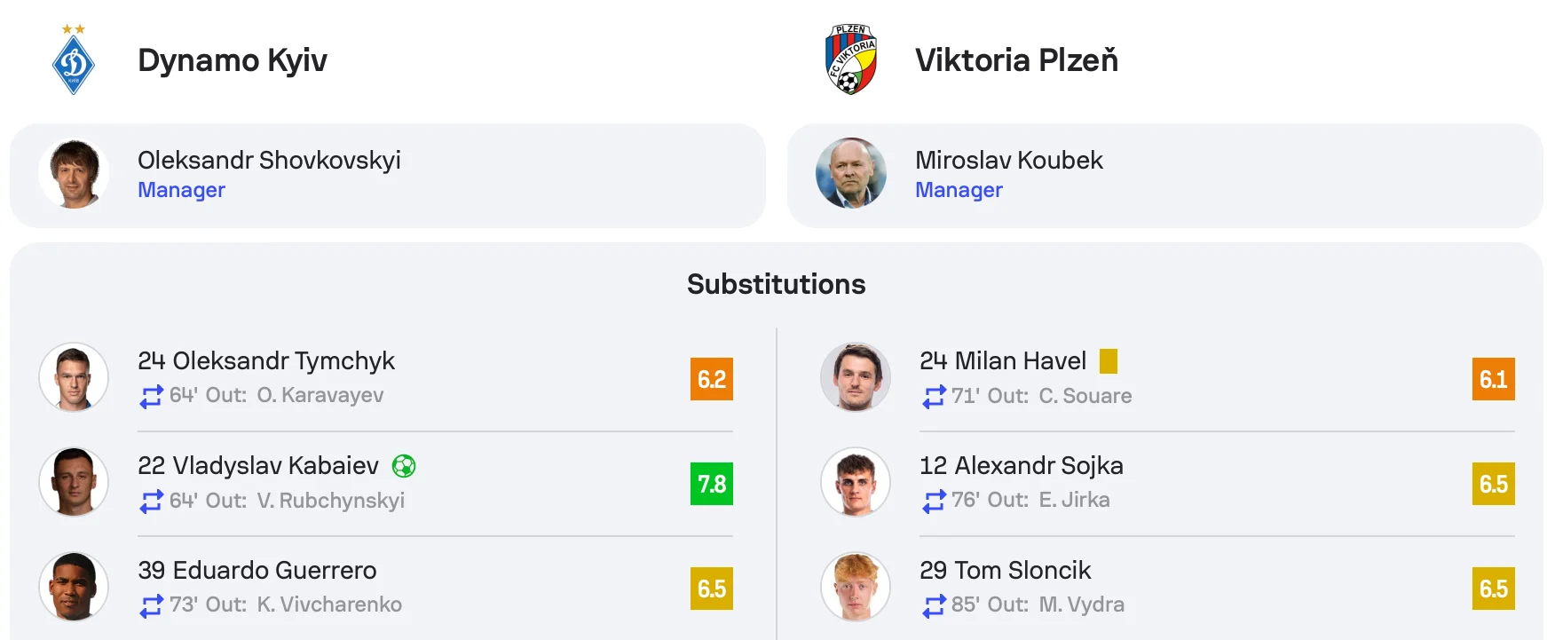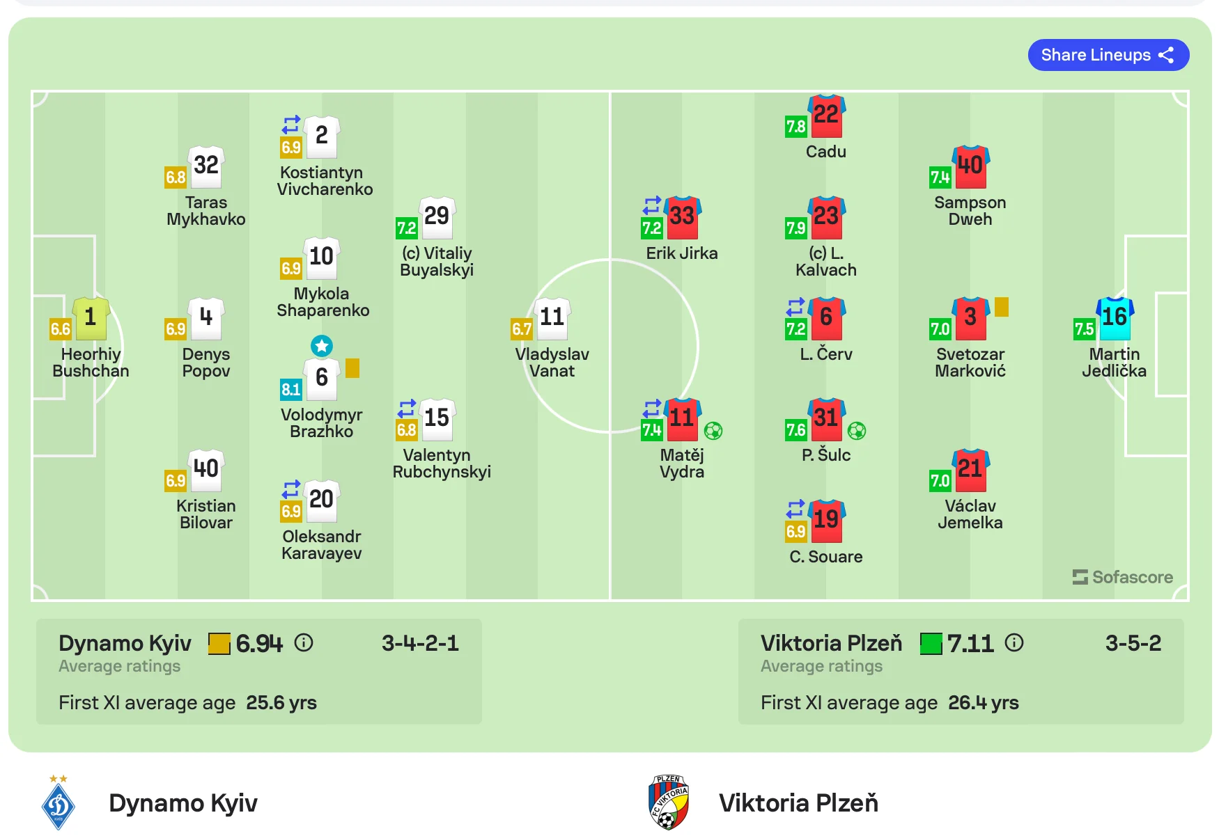 Статистический портал SofaScore оценил выступления игроков в матче Лиги Европы Динамо –Виктория Пльзень (1:2).