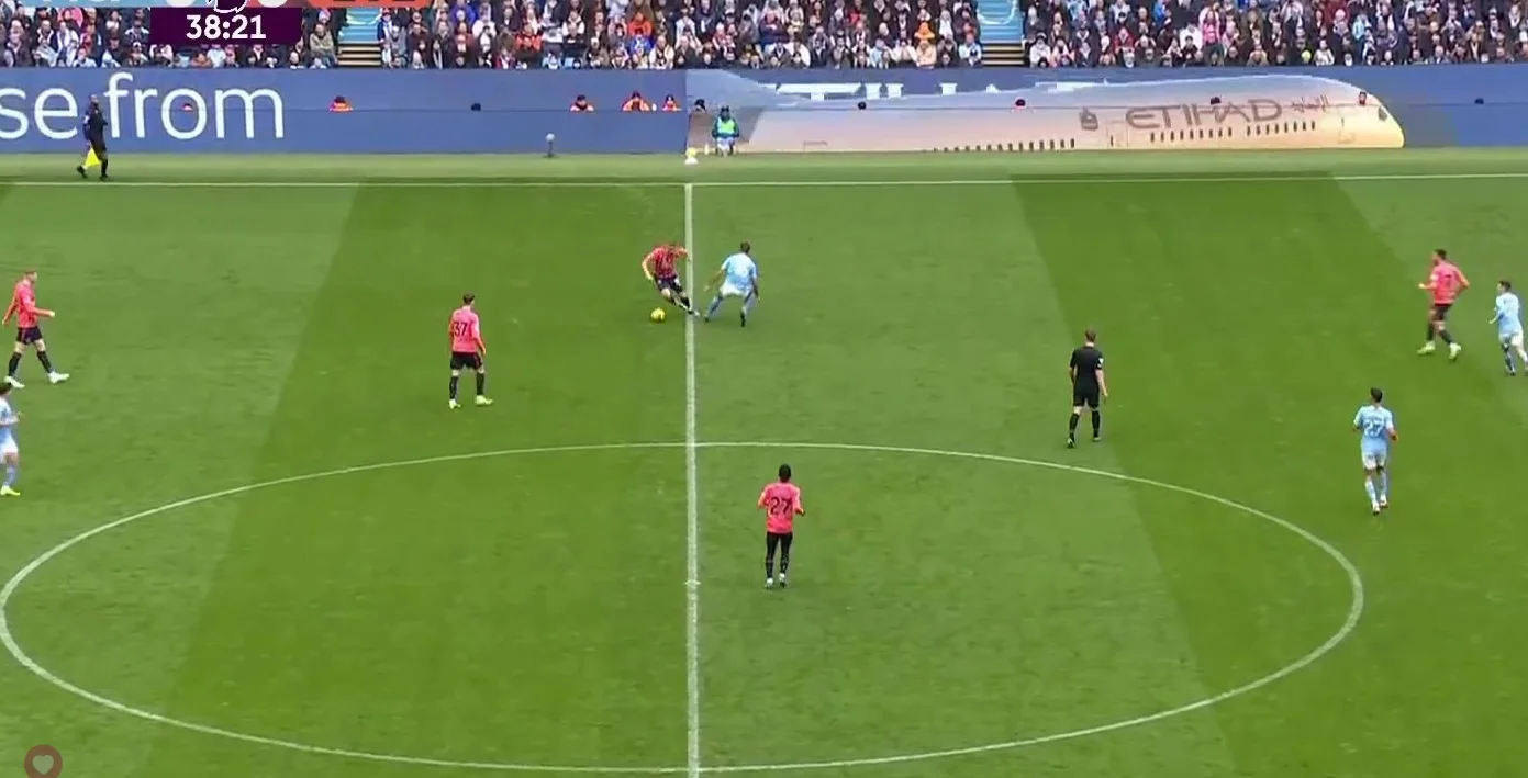 Холанд чувствовал себя не в своей тарелке. Главную звезду Сити накрывали в момент приема мяча, нередко – сразу трое соперников. Однако, на 27-й минуте норвежец переиграл Миколенко в воздухе и пробил с нескольких метров над перекладиной. В этом эпизоде также нужно отметить супербыстрого Доку, который проскочил двух соперников и подал на дальнюю штангу. На фоне невыразительной игры Ман Сити в соцсетях завирусились два курьезных момента. Калверт-Льюин буквально вынес Рубена Диаша за пределы поля борцовским приемом.