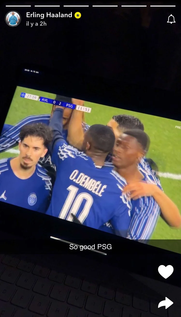 Эрлинг Холанд смотрел матч по телевизору, поделившись фото в соцсетях. Нападающий Манчестер Сити отреагировал на второй гол парижан, написав: "Очень хорошо, ПСЖ".