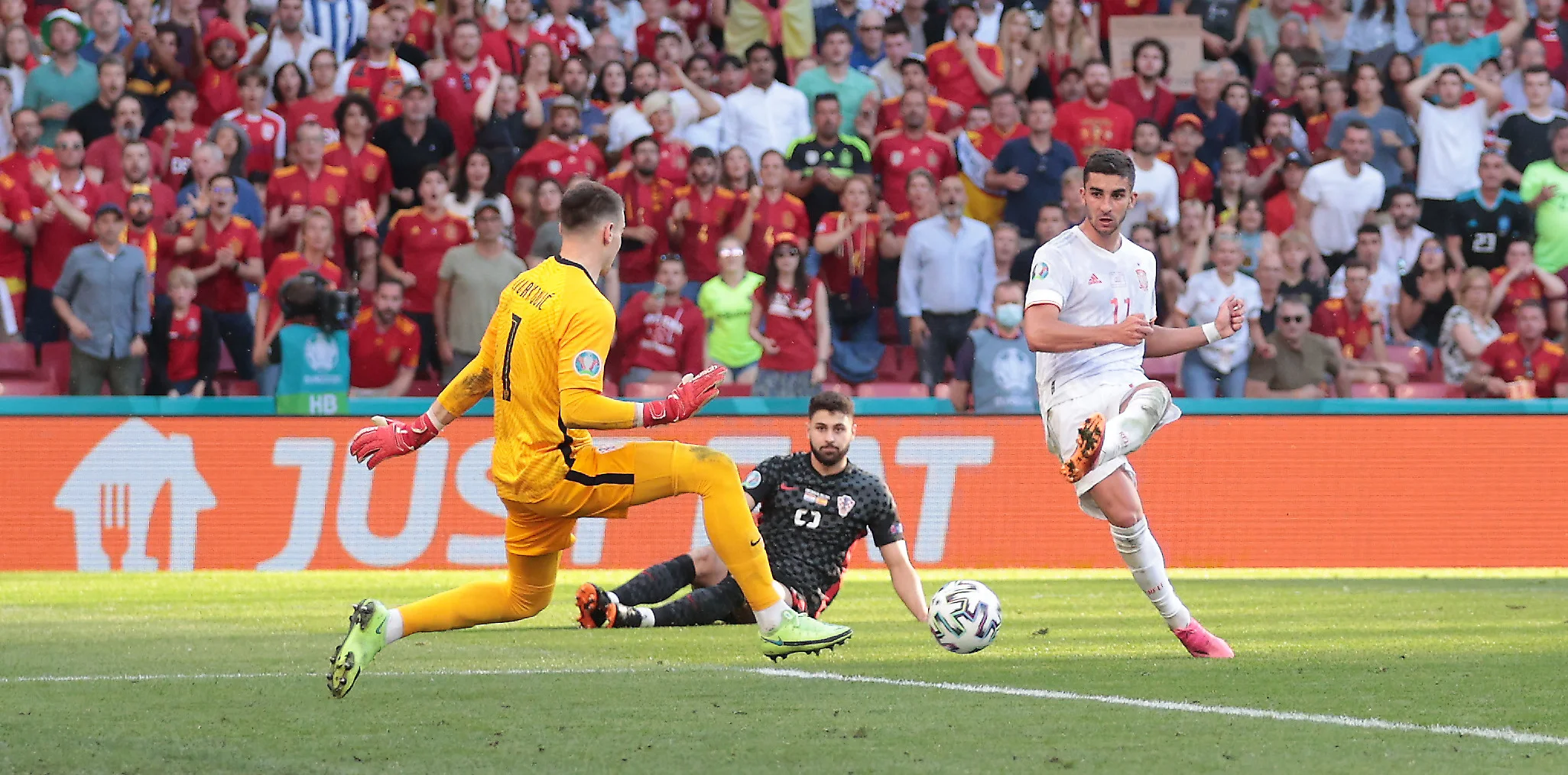 Хорваты неожиданно повели в счете на 20-й минуте. Гол привезли сами испанцы: Педри слишком сильно отдал передачу назад, а голкипер Симон промахнулся и не сумел выбить мяч, и тот влетел в ворота.